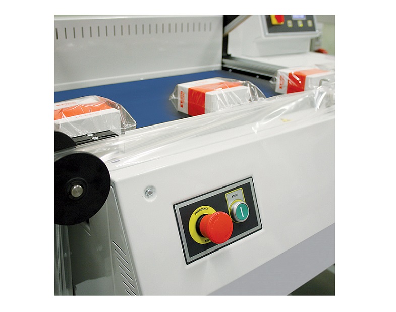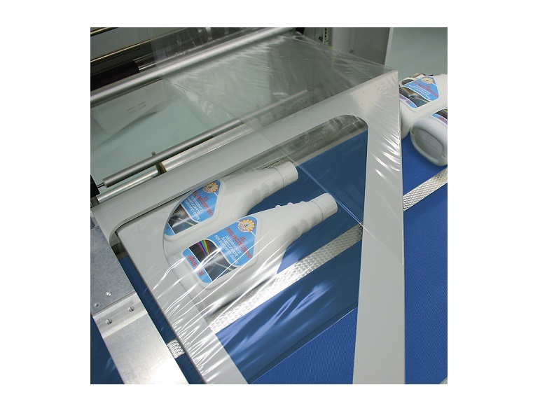 Принцип работы: L-образный обрезчик с автоматическим приводом опускания планок выполняет функцию отрезки и сварки пленки, далее приводной транспортер перемещает продукцию в тоннель, где производится термоусадка продукции.