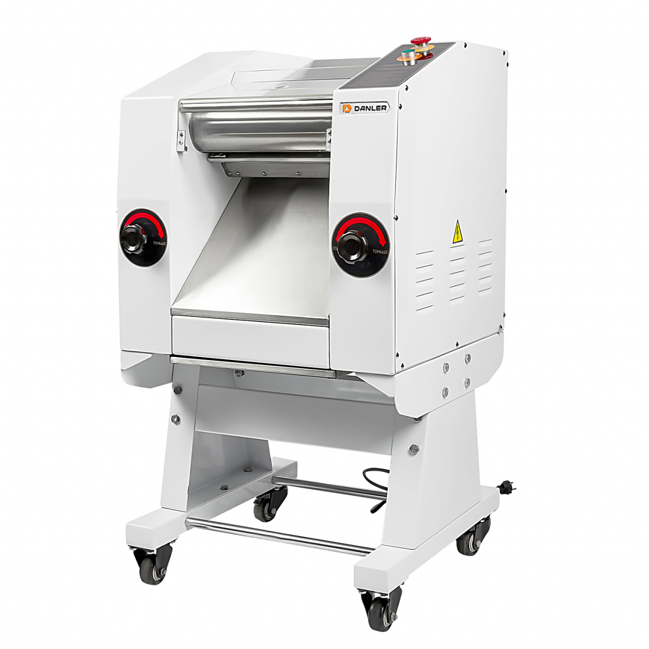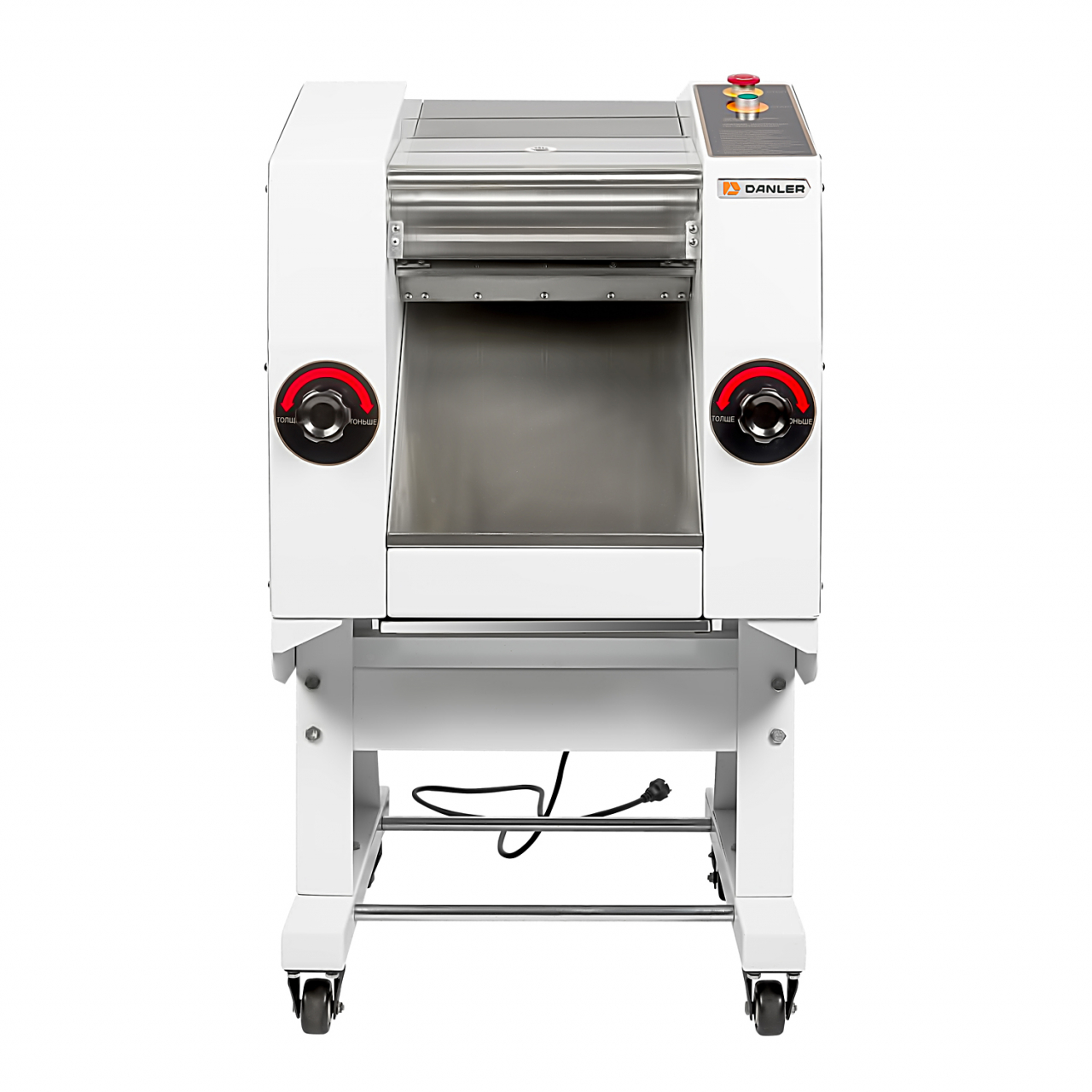 Ширина раскатываемой заготовки 350 мм, толщина 0,2-11 мм. Раскаточные валки выполнены из нержавеющей стали. Плавная настройка изменения толщины теста. Выдвижной стол. Управление осуществляется электромеханической панелью. Машина проста и надежна в работе, она легко моется и обслуживается.