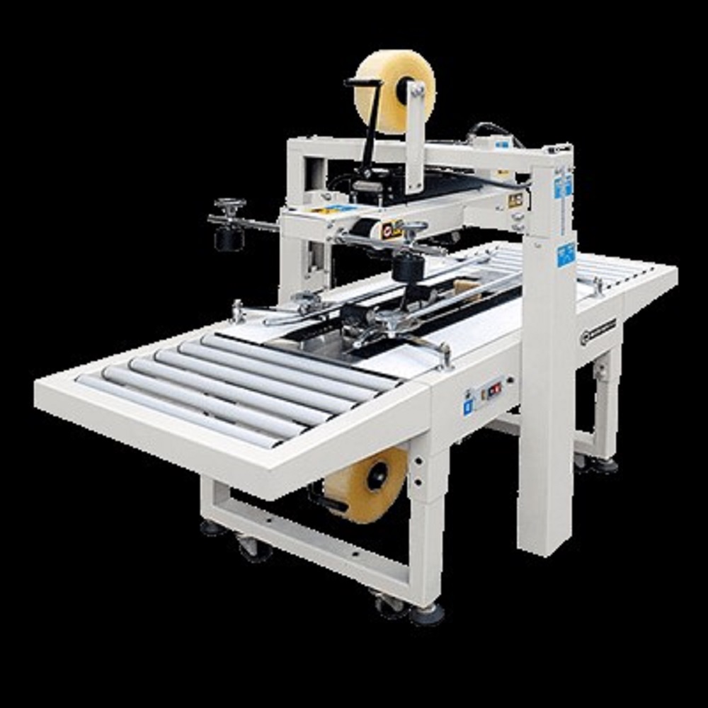Универсальное полуавтоматическое оборудование для склада, используется для заклейки коробов любой длины. Оператор придерживает верхнюю крышку короба перед подачей в рабочую зону. В комплектации нижние и верхние протягивающие ремни, что обеспечивает надежное одновременное склеивание нижней и верхней частей короба. Настройка под параметры короба производится механически. Может использоваться в качестве отдельного станки или в составе технологической линии полного цикла.