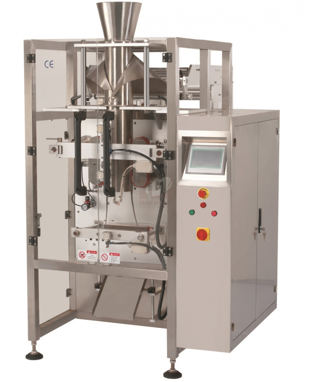 Упаковочный станок-автомат вертикального типа для работы с продукцией любого типа (до 3000 мл). Может работать в одной технологической линии с дозаторами следующих видов: комплексным мультиголовочным, шнековым, жидкостным; также в системе может быть установлен полуавтомат для загрузки продукции в дозатор. Рабочие узлы станка, которые взаимодействуют непосредственно с продуктом, изготовлены из нержавеющей стали марки 304, характеризующейся повышенными антикоррозийным свойствами. Необходимо отметить оптимальное соотношение цены и производительности данной модели. Управляется программируемым контроллером PLC. Уникальный интерфейс на русском языке дает возможность управлять машиной без специальной подготовки.