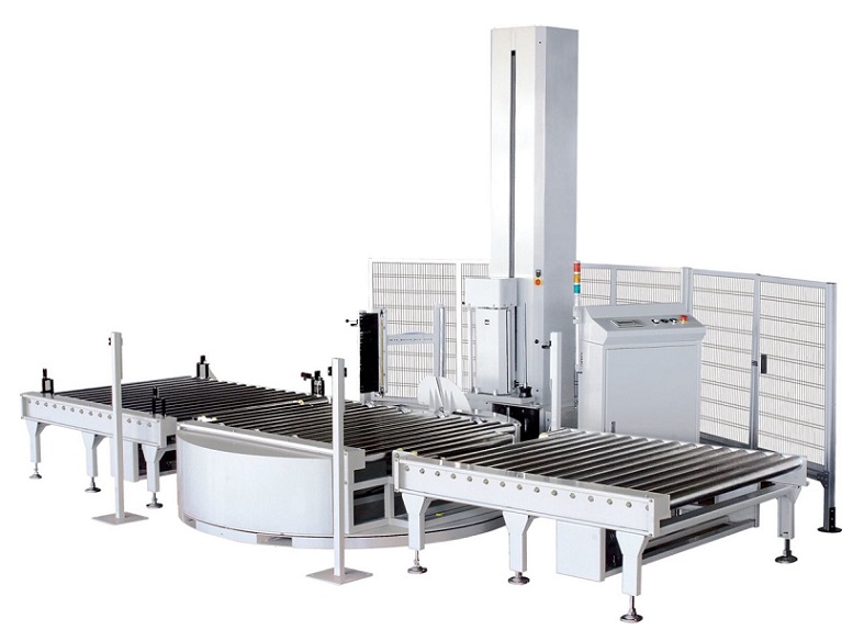 Данное оборудование разработано итальянскими инженерами, произведено в Китае. Обмотка груза происходит при помощи вращающегося поворотного стола, на который паллета загружается автоматически. На конвейер паллеты могут поступать как при помощи вилочного погрузчика, так и автоматически с паллетайзера или конвейерной линии. Роликовый приводной конвейер для перемещения паллет заказывается отдельно, устанавливается на входе/выходе паллетоупаковщика.