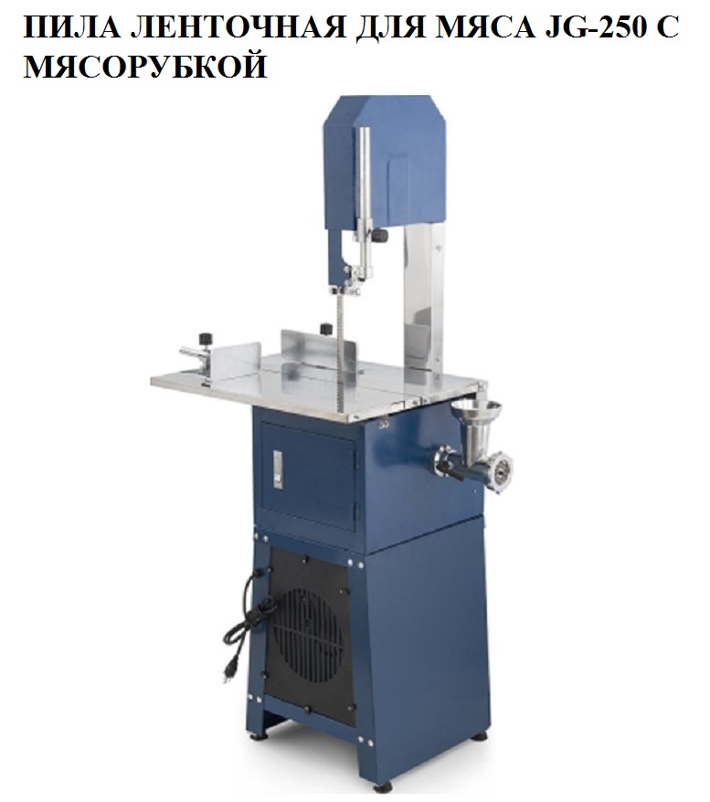 - Режущее полотно, замкнутое в кольцо, натягивается за счет двух роликов. Во время работы оно движется перпендикулярно станине, разрезая мясо.