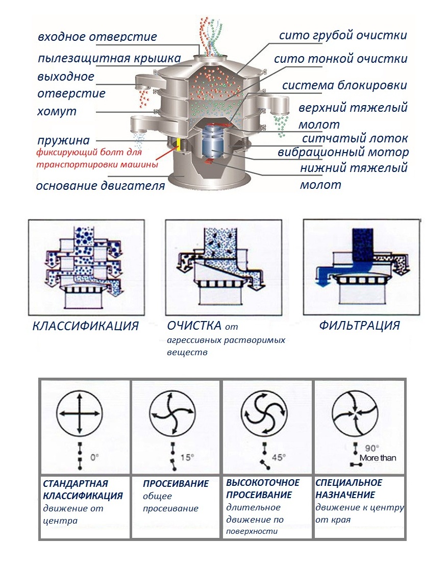 - В конструкции использован вертикально расположенный мотор и молотки-эксцентрики, которые изменяют направление вращения в горизонтальное, вертикальное и наклонное по мере продвижения продукта к поверхности экрана.