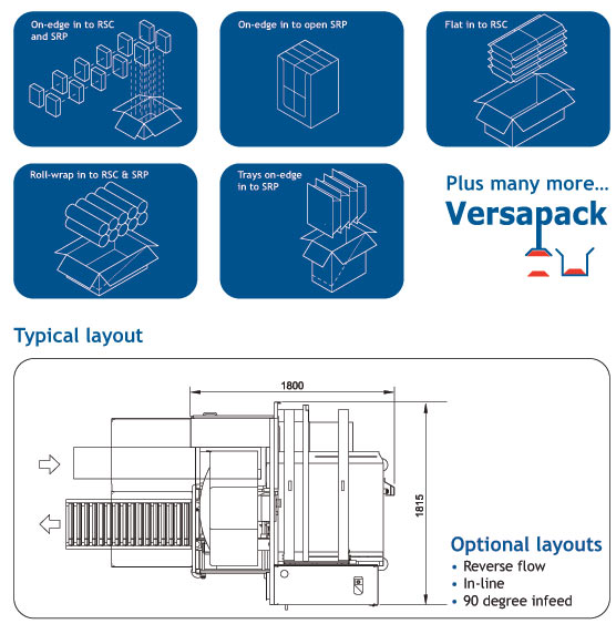 Оборудование серии Versapack – это система, сочетающая в себе возможности формировать коробку и наполнять ее, отличное совместное решение от Endoline и Quin. Незаменимая машина на любом производстве. Доступны всевозможные способы наполнения продукции, в том числе и укладка на грань или укладка слоями. После наполнения короб может быть заклеен скотчем или клеем. Доступны разные типы упаковки: