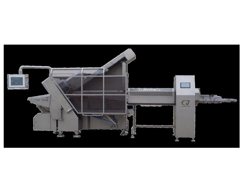 - Машина оснащена автоматизированной системой загрузки продукта и линией вывода мермы – кусочков продукта, попавших под зажим. Длина загрузочно-накопительного конвейера по желанию может варьировать от 1200 до 2400 мм. Весь процесс приема продукта на нарезку полностью автоматизирован.